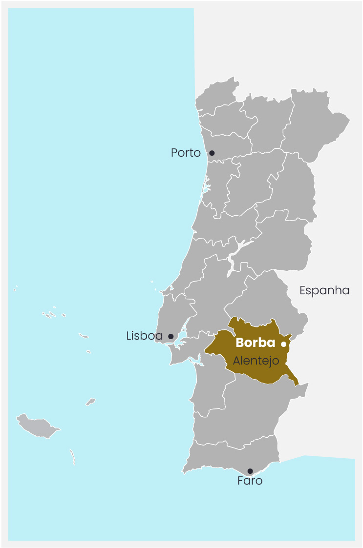The Borba region is the second largest wine sub-region in the Alentejo. Located on a plateau above 400 metres and influenced by the Serra d'Ossa, it benefits from a unique microclimate, with rainfall slightly above the regional average, cool nights and hot, dry summers, typical of the Alentejo. Based on calcareous and schist soils, well drained and with good water retention, this region combines natural conditions with a long wine-making tradition, with knowledge passed down through generations. The result is balanced and elegant wines, with freshness, structure and distinctive aromatic profiles.